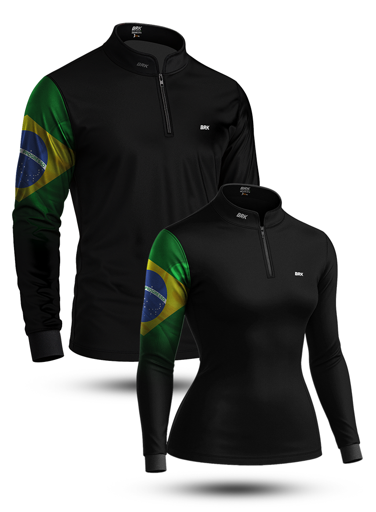 Kit Camisas UV50 Casal Preta Bandeira do Brasil